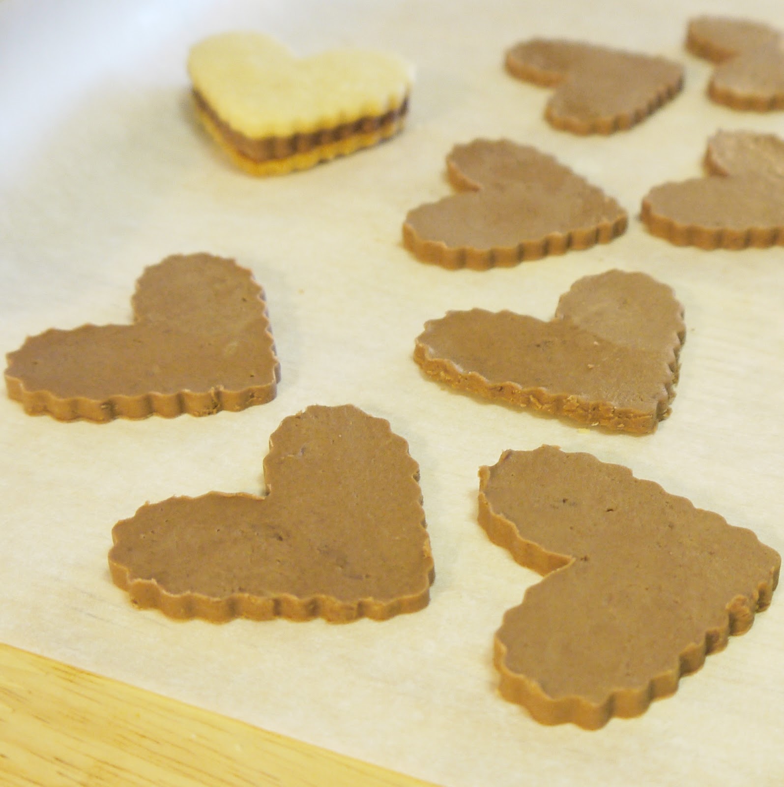 Working with one half (or disk) of the dough at a time, sandwich the dough between two baking-sheet-sized sheets of parchment paper and use a rolling pin to roll out the dough to a thickness of about 1/4 inch. If the dough is too dry to roll out with out cracking, wet your hands and gently pat the cracked areas back together. Remove the top sheet of parchment and cut out hearts or the shape of your choice. I used a 2-inch-tall, ripple-edged, heart-shaped cookie cutter.
